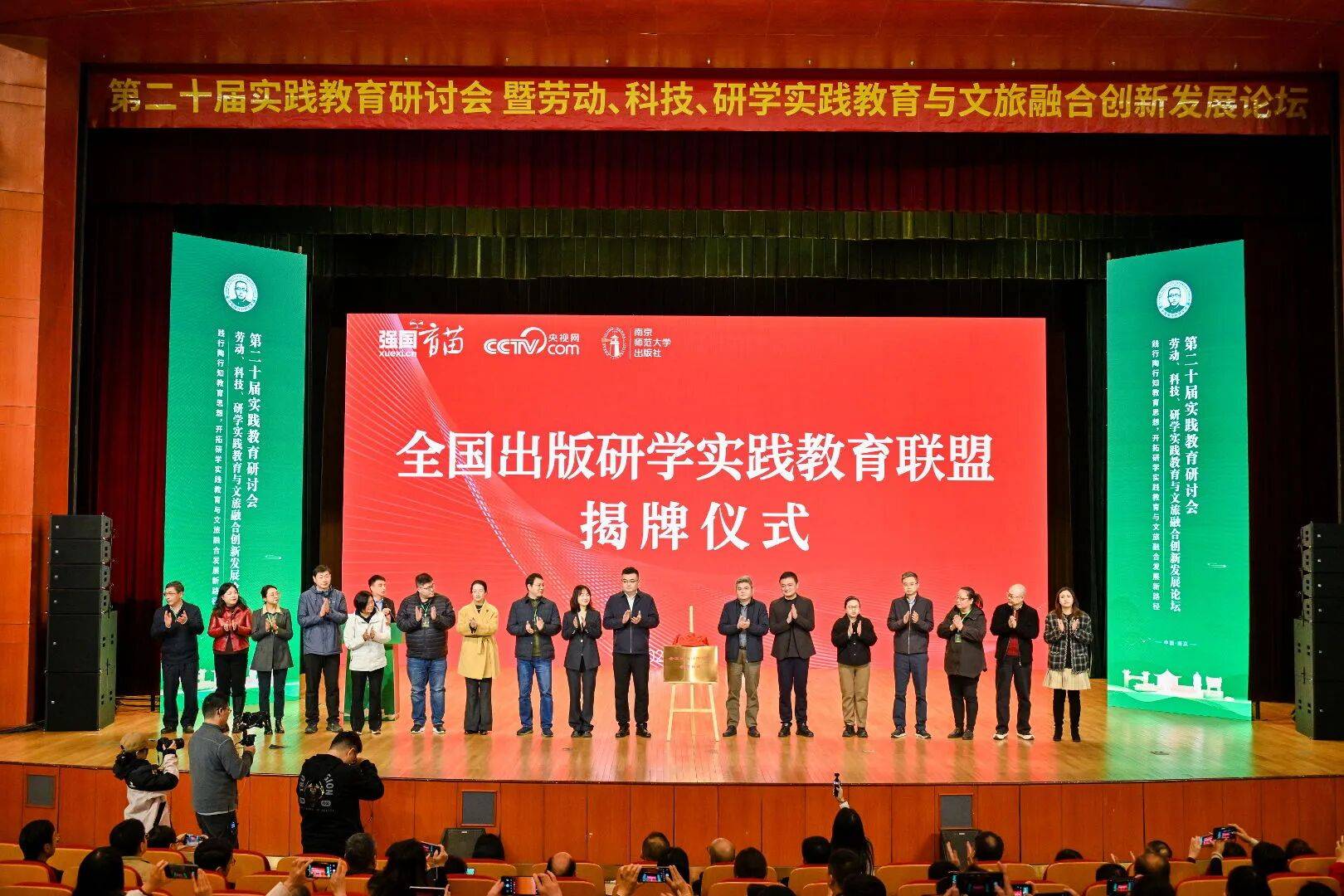 为系统性推动优质教育内容与社会场景融合,由南京师范大学出版社与“学习强国”学习平台联合发起,央视网提供媒体支持的“全国出版研学实践教育联盟”在大会上正式成立。联盟发起单位代表“学习强国”学习平台事业发展部副主任姜恩政,央视网江苏分公司总经理曹坤凯,南京师范大学出版社党委书记、董事长、社长张鹏共同为联盟揭牌。